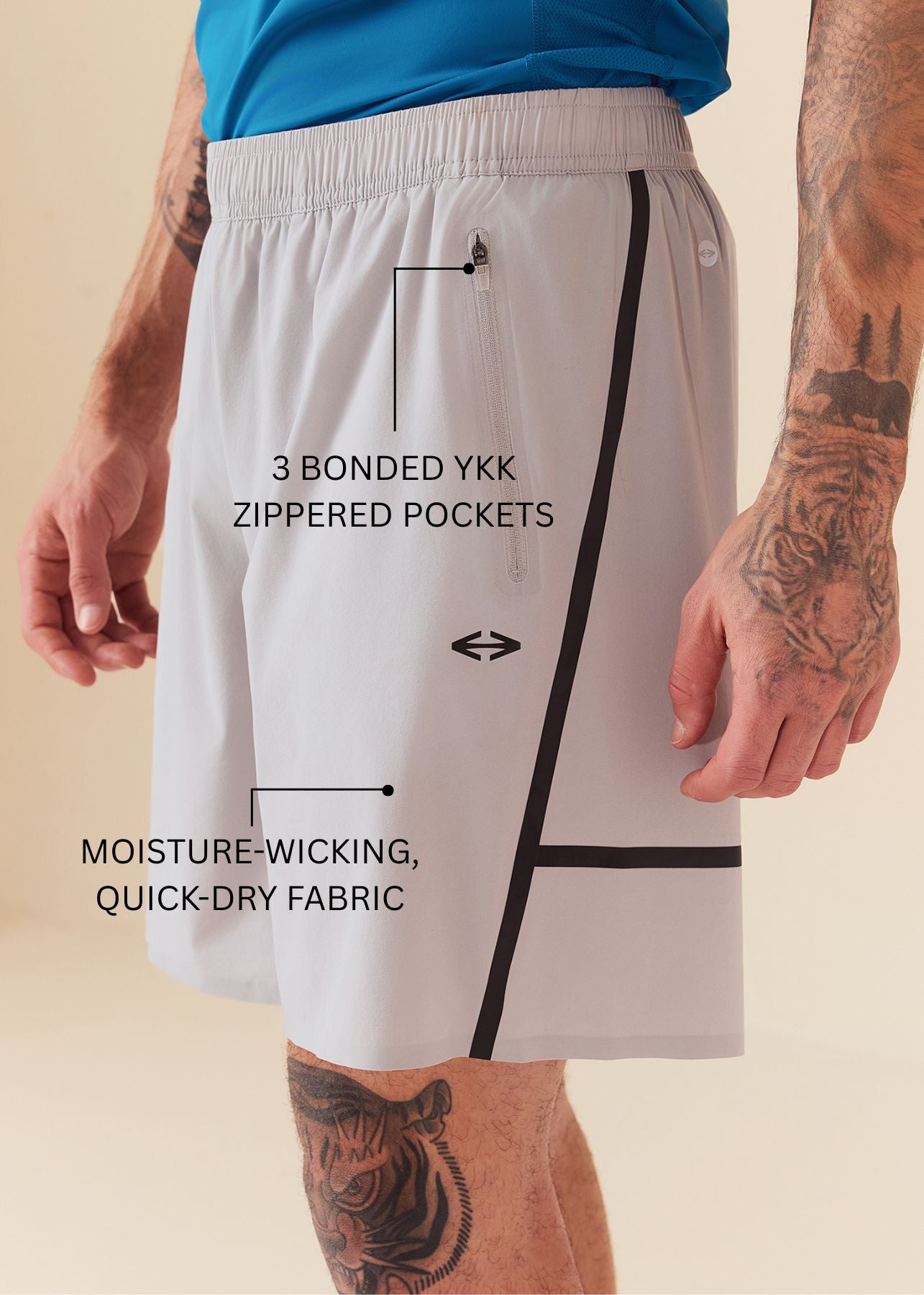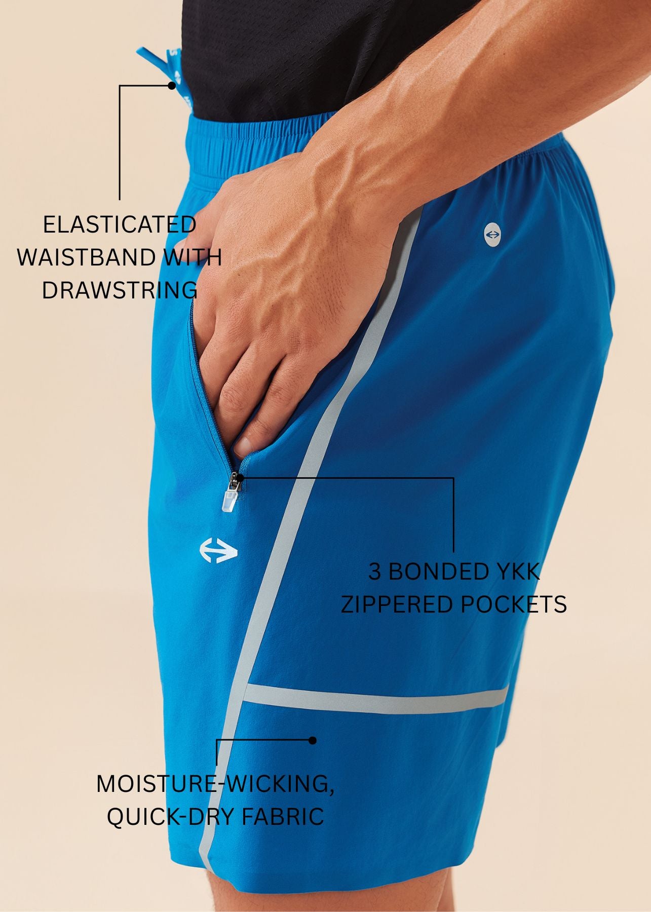 Designed for functionality and style, these men’s shorts feature three YKK zippered pockets for secure storage and bonded details for a sleek, modern look. The elasticated waistband with drawstring provides a comfortable, adjustable fit, while moisture-wicking, quick-dry fabric keeps you cool and dry. With a performance fit that allows full mobility, these shorts are perfect for running, training, and everyday workouts.